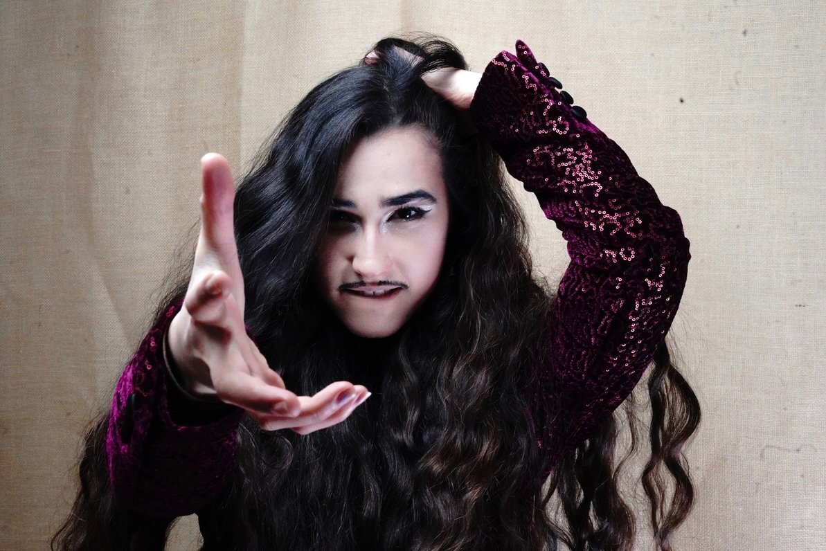 I have always been a very thespie, music-y person. Mainly into musicals and stuff – I did a lot of musical theatre at school but then when I went to uni I started doing improv comedy with the Oxford Imps. I started writing sketches, so I came into it kind of through a comedy lens and then when I was doing my finals and it was procrastination time, I thought right, well, I’m gay as fuck, I should probably try drag! Also, at the time I was kind of questioning gender stuff and I was like I don’t really want to start binding my chest – is that something I wanna do? And then I was like ooooh I’m just non-binary and I like doing drag.