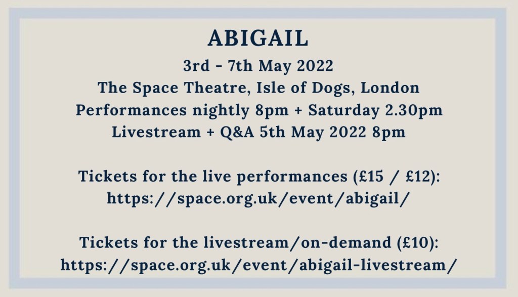 So there you have it! Remember: Abigail is at The Space Theatre, Isle of Dogs from 3 – 7 May 2022 and you can find your tickets here.