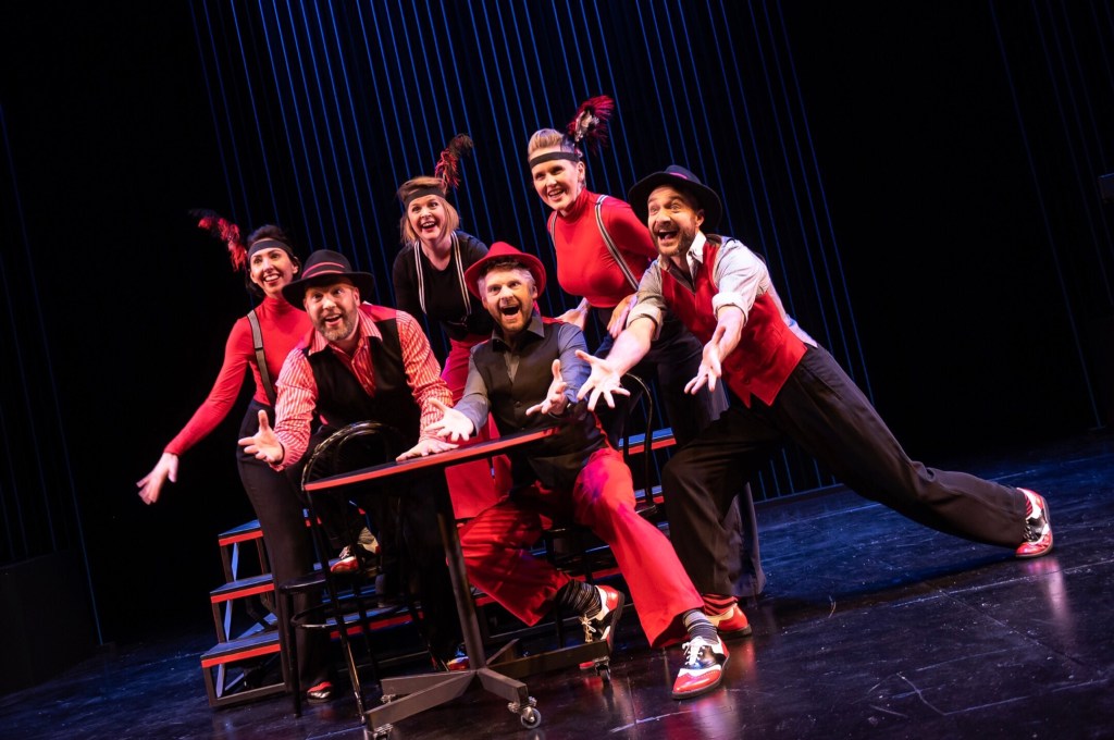 And everything is cannily geared towards versatility; a blank canvas stage (Simon Scullion) offers a movable doorway and steps available to take whatever capacity necessary. Costume from Gabriella Slade is almost circus-crowd in aesthetic with bold red and black combinations – and with the odd silly hat put to good use, too. Lighting (Bruce Benzie, Tom Clutterbuck, Damian Robertson) is also improvised in line with the unfolding narrative and Ali James’ movement direction allows the cast to take any guise needed while armed with some statement jazzy choreography.
