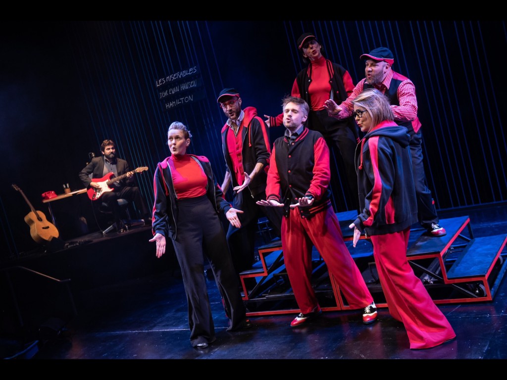 Co-creators and directors Adam Meggido and Dylan Emery really do bravely open the floor to all possibilities here. With our host of sorts Sean McCann having given the audience free-reign to select the theme, location and title, decision-making about musical styles is also duly handed over to us. Leaving so much to chance and random selection does run the risk of disappointment, as the pair who scarpered from this political take-down around half an hour in might testify, but the talents of the cast are definitely worth seeing regardless of the luck of the draw in terms of theme. At this show, the selected musical fodder included Jesus Christ Super Star, Annie Get Your Gun, Rent and Hamilton and it’s certainly a testament to the expertise on hand that they encourage the audience to be broad in their selections across genre and era, allowing for some interesting variety to appear. That said, it sometimes feels a little too loose on the musical-inspo side, with some improvised numbers not necessarily channeling those selected musical foundations beyond a vague “in the style of”…