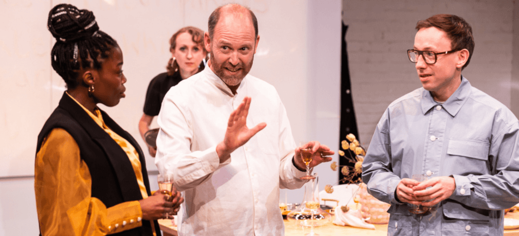 As Charles, Matthew Pidgeon creates a good balance between palm-clasping sincerity and aggressive defensiveness lying just beneath the surface. Kate Copeland’s Virginia is very much the uptight wife who likes to show off her intellect and her family as much as she hates to be “upstaged”. Nick Blakeley’s take on the know-all art dealer is great – all arrogance and schmooze as he unwittingly helps to unpick layers of ignorance. And as the son, CJ Coleman brilliantly captures the exuberance of youth and the complexities of seeking to support and to be informed without over-stepping. He speaks a lot of sense but also manages to undermine his good intentions with flickers of insulting projection and presumptions along the way. Alex provides a kind of middle ground – a recognition of the need for white people to engage more fully but also a lesson in how to avoid monopolising.