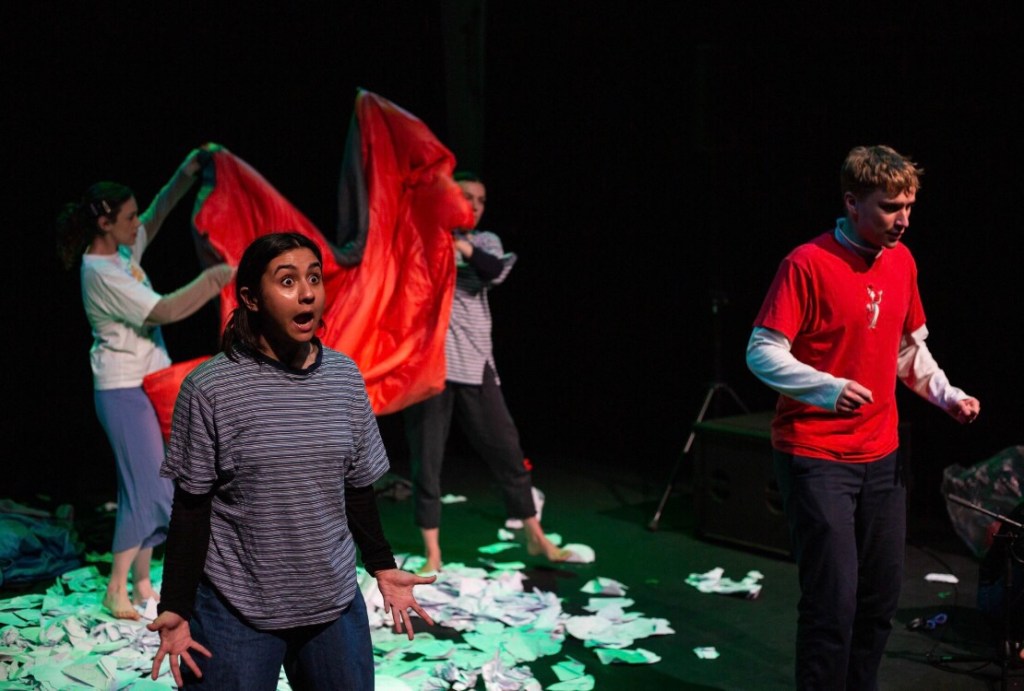 The piece charts a Year 6 group trip to the Isle of Wight whilst exploring the world of our dreams and the most dramatic parts of our childhood. Everything seemed bigger, more dramatic, and more consequential when we were 11 years old. Each one of these characters highlights this in their unique way, whether it’s Isaac (Ella Downey) failing to chart the proper course through a group caving exhibition (and never getting over it), or Toby (Alasdair Linn) finding out that Lucy (Hannah Taylor) might have a crush on him (and getting sick over it).