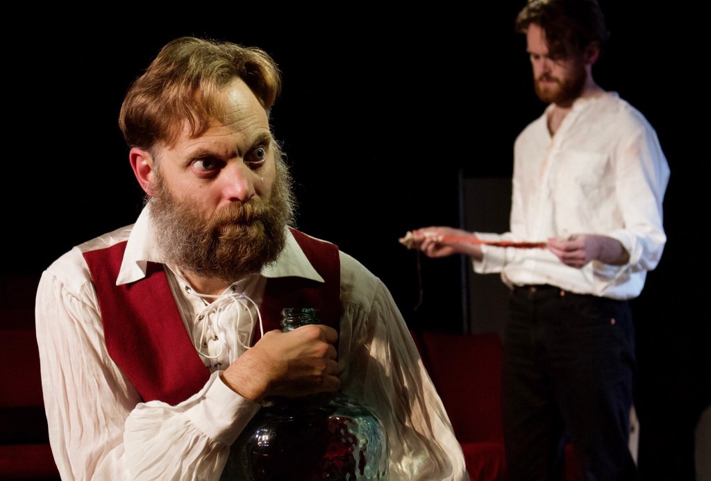 The ensemble cast (with Caleb O’Brien joining Callaghan and Flammiger as ‘Stranger’) does a brilliant job of endowing these massive, intangible, off-stage elements with a high level of importance. From this, we experience the full impact of the Captain’s loss. As he slowly, deeply inhales the last bit of remaining seawater, for instance, the lights focus on the glass container as if it were a heavenly angel. We see a man without a purpose. In fact, it almost seems as if the entire world has been made redundant through this singular, seemingly small loss.