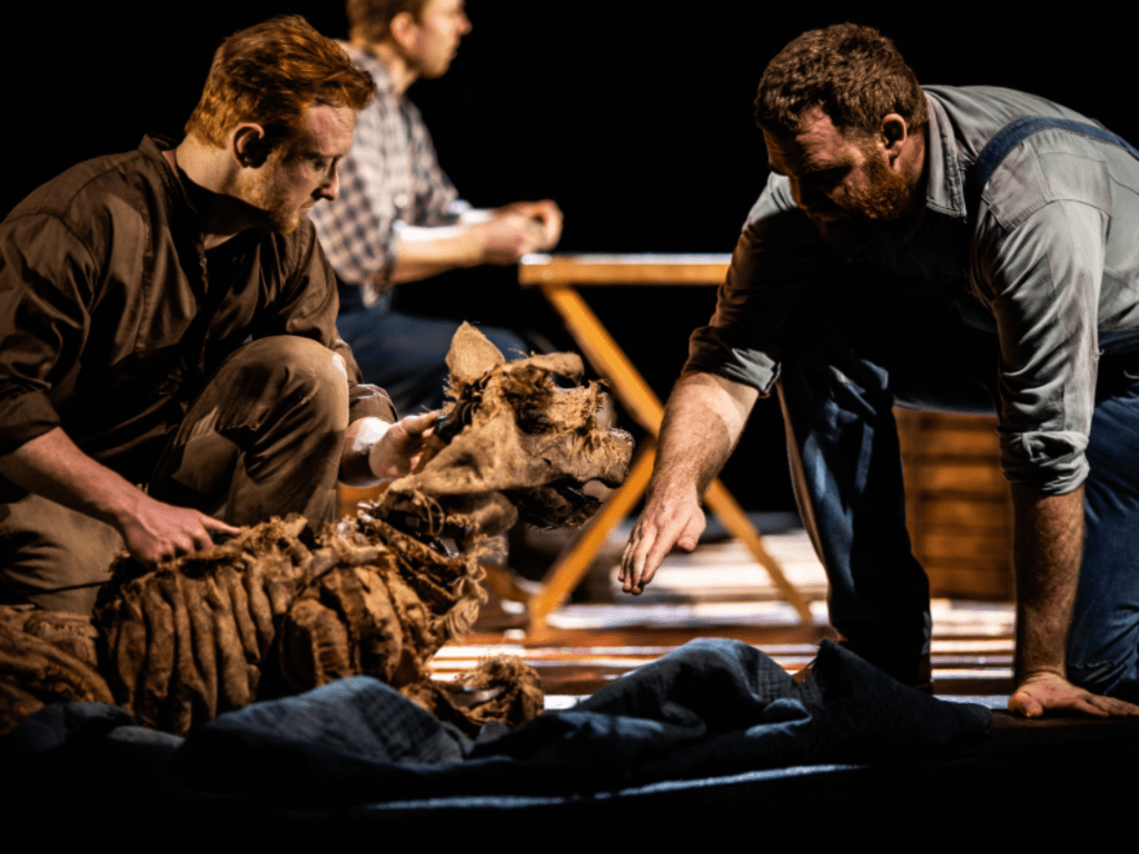 Khan also shakes things up a bit with some puppetry and scene transitions which bring in music and song (Composer and sound designer: Elizabeth Purnell) performed by the ensemble – a welcome addition and good respite from those lengthy scenes of dialogue. Puppet designer, director and maker Michael Crouch gets top marks from me, as does puppeteer Jake Benson, who bring to life Candy’s old dog with all the charm and pup cuteness required to secure sympathy later. Other visuals of note include Ciarán Bagnall’s clever set, which conjures a bunkhouse from fence posts and features an imposing roof capable of shifting position.