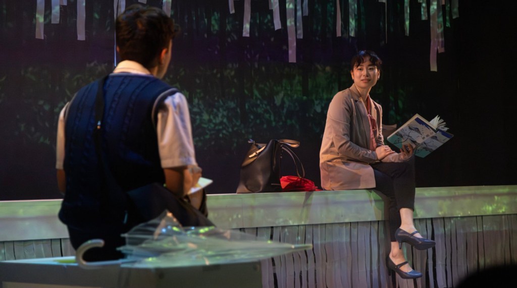 Without getting into the intricately woven plot too much, what’s more important are the theatrical devices that contribute to the narrative cohesion. The set (design courtesy of Cindy Lin, Kelly Loi) is a collection of different textures: projected imagery (courtesy of KENNY) of a beautiful, leafy garden where it always rains coupled with slitted sheets of paper onto which the projected rain falls lightly.