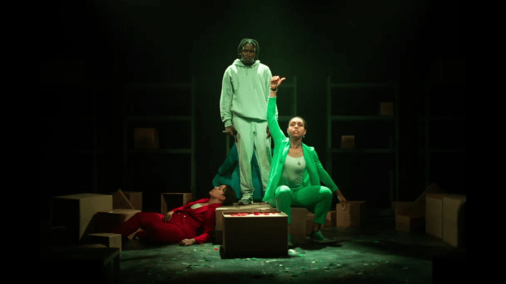 Throughout, experts are brought in via voiceover to discuss important but heady dilemmas surrounding the criminal justice system: ‘Locking people up should be a last result’, ‘Prison is an expensive failure’, ‘The justice system is like a hallway’. Symbolising all of these bigger, systemic themes is a fourth performer: an anonymous, smooth and slick man- a Ghost- (Stanley Duventru-Huret) introduces a new vocabulary to the three dancers we met on stage at the beginning of the show. He routinely tosses piles of dust and confetti as each new name (most definitely the names of prisoners killed at Woodhill) is voiced from above. This character possesses all of the dark camp of ‘HIM’, the infamous villain from The Powerpuff Girls series: at times, he oscillates between embodying the incarcerated men and acting as ‘judge’ during the inquest scenes. It makes for a dynamic embodiment of some (again) very vast, difficult-to-comprehend themes.