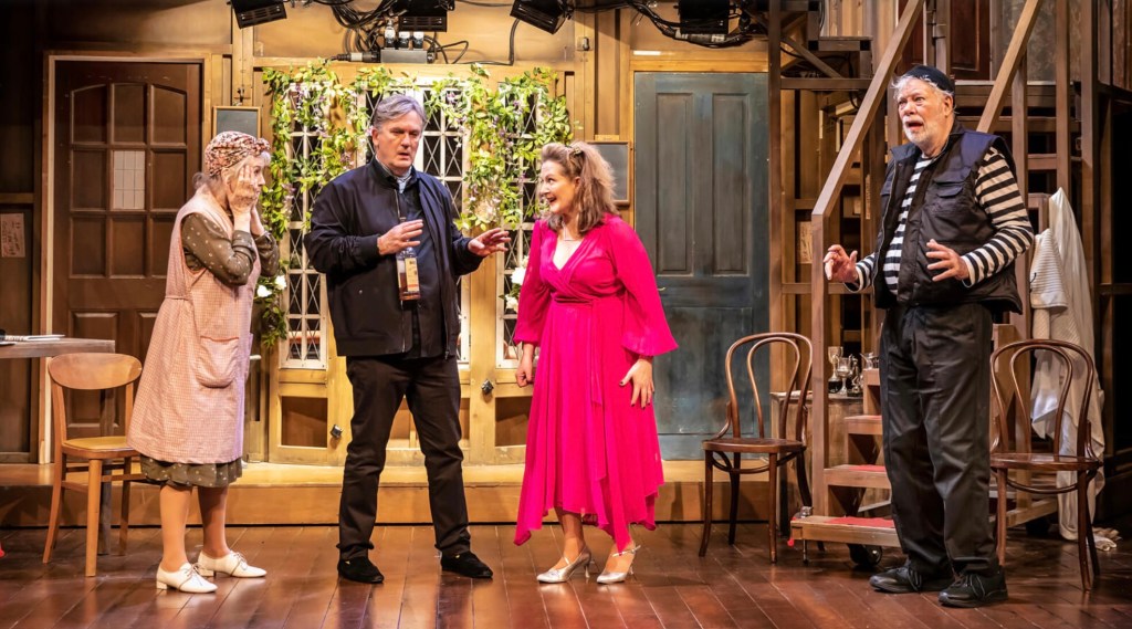The piece takes shape as three performances from varied angles: an eventful dress rehearsal, the chaotic opening night, and an omni-shambolic performance much, much later in the run – with Simon Higlett’s neat set cleverly pivoting to show us the onstage and backstage areas. So as an audience, we’re getting the overarching narrative of a classic bedroom farce and an entertaining peek behind the curtain as the cast fluff lines or miss cues during the dress, or almost miss cues on the first night thanks to frictions and rebellions backstage. It’s clever stuff – and very entertaining.