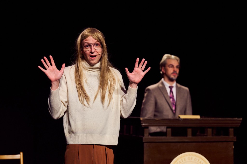 One standout moment: in Act II, set in 2023, Gwyneth decides to bring a surprise witness to the stand for her trial. Spontaneously selecting a member of the audience, Gwyneth introduces the audience member as an Accident Reconstruction Expert. His findings are presented on chart paper, on a stand rolled on by a very cooperative stagehand.