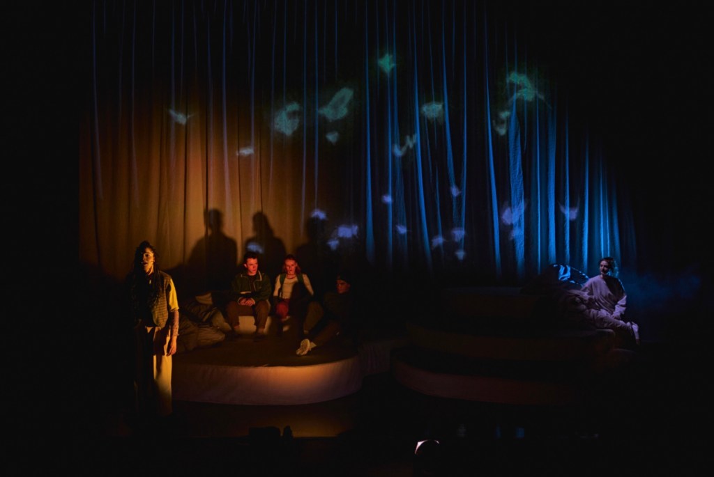 Set in Newcastle and conjuring coastline, classroom and canal path with poetic narration, the production takes great pains to paint pictures with words but also makes excellent use of Si Cole’s evocative video designs. Our stage remains set though, with a series of white platforms which transform to black for Act 2 which takes us to the underworld. It’s with the hidden alcove and use of dramatic curtains which allows real appreciation of Verity Quinn’s set design, offering pleasingly dramatic visuals, while Emily Levy’s compositions (with music performed by Zak Younger Banks) are at their most impactful when our cast launch into haunting harmonies in the underworld.