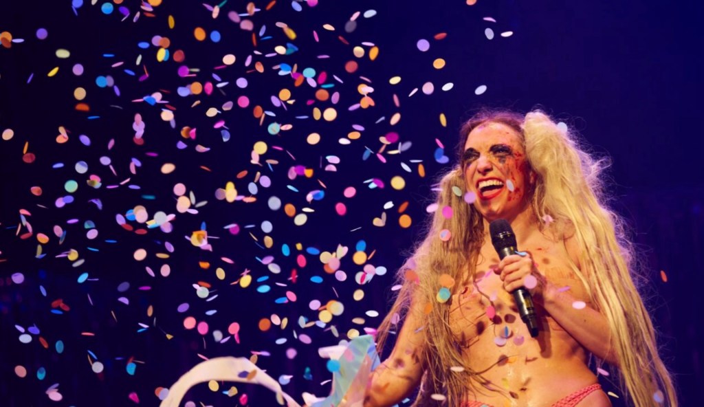 Other parts do fit better, though: the built-in ‘interval’, in which McCormick rolls on a short and hilariously pathetic IKEA drinks cart, sees Lucy doing the whole show on her own. She puts towels down over spilt wine and pee puddles on stage right and stage left respectively. There is no clean up crew but her. Likewise, for the very last musical number, she enlists the audience once again: ‘You! Grab that broom! Everyone, start putting the confetti back in the bags! Streamers back towards the stage please! We’ve got another show right after this one’!