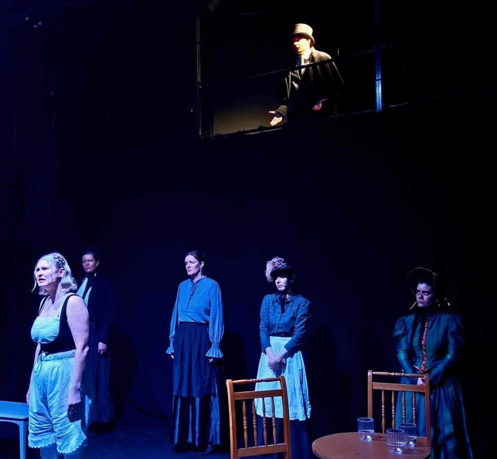 The play takes us to 1888 through costuming and dated expressions in dialogue but entertains no fuss with set or staging. In this imagining, the five are known to one another and meet to tell tales of their days and to enjoy some name calling of a blue nature (although there is no evidence to suggest that the women did ever meet). In turn, these women tell us a little about themselves, or else we learn about them by eavesdropping on them. They’re all clearly of the streets in one way or another, down on their luck and struggling to make ends meet – but not necessarily as prostitutes as was all too readily assumed at the time.