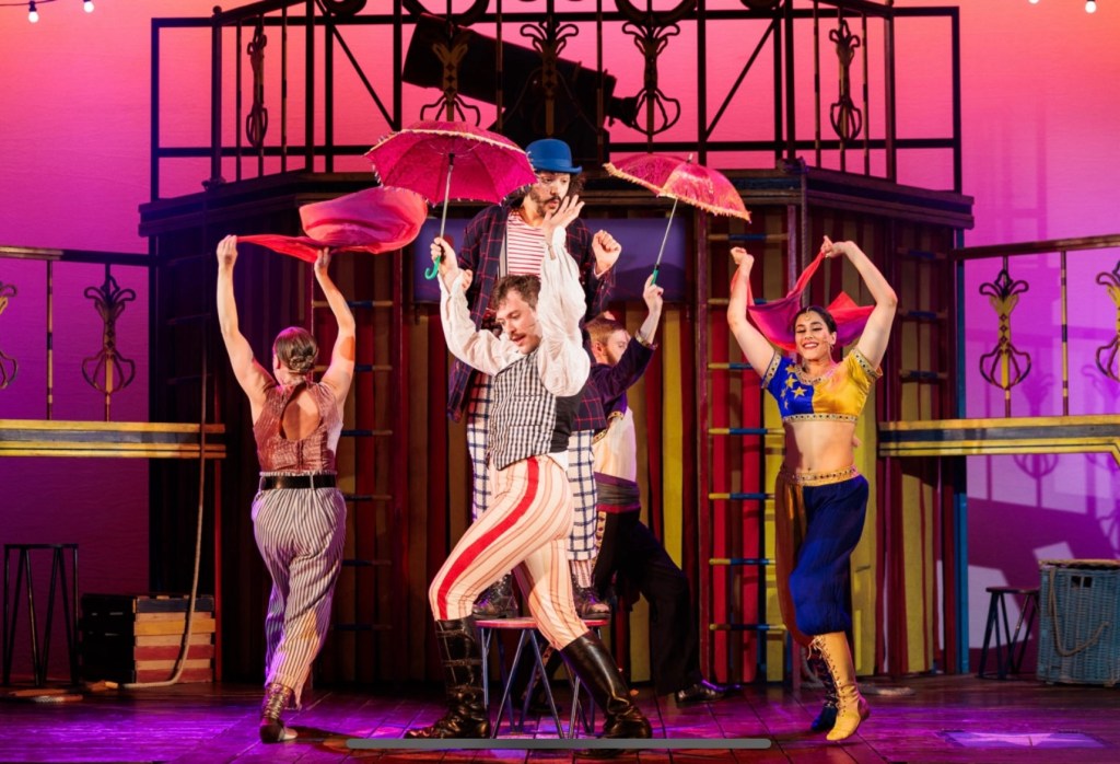 As the “true lead”, Phileas Fogg, Kiefer Moriarty entertains in an upright, entitled manner. He is a man of means and a man kitted out with every mannerism of a privileged Victorian male – but only gently mocked here. Maria Gray entertains as both the talented acrobat and the adventurous Nellie Bly, telling her story with great warmth and enthusiasm whenever she can sneak centre stage.