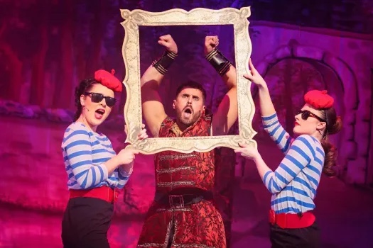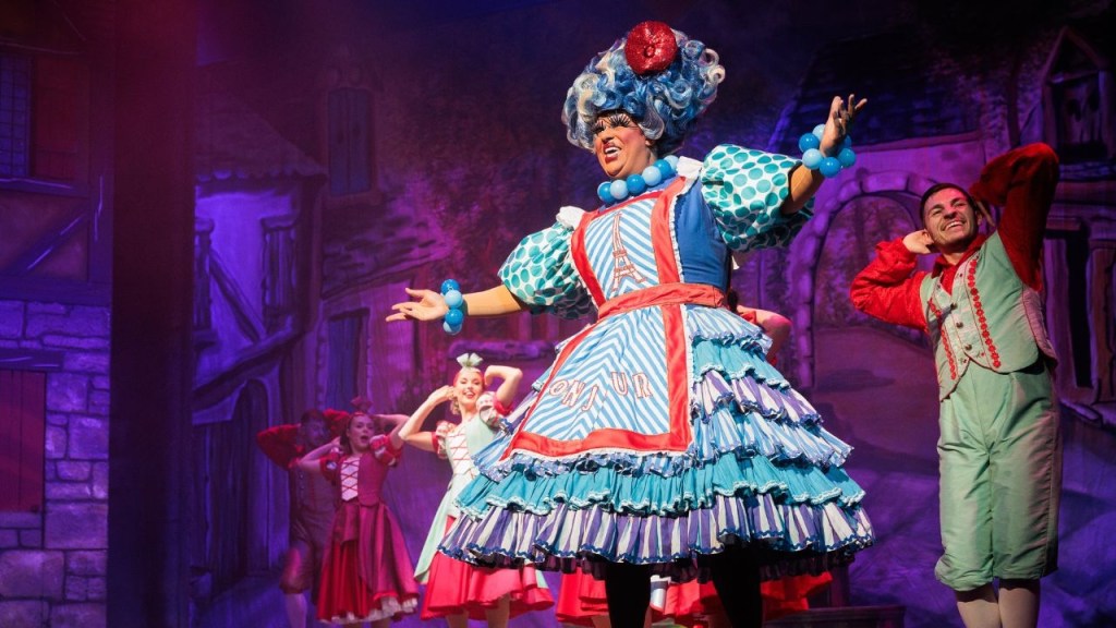 Leon Craig steals the show as a dame for the history books in Polly La Plonk – daring, cheeky and larger than life, Craig brings all the right notes to the evening’s many comic highlights. Phil Reid is Louis La Plonk, son of Polly and resident fool, with enough energy to light the whole production solo. He’s a hoot (and at this performance a consummate professional, quick on his feet when things don’t go to plan). Meanwhile Belle’s papa, Clement, gets both warmth and surprising flashes of comic flair by David Alcock.