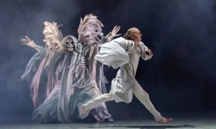 Lez Brotherston impresses once again with rich production design; the office and chambers of Scrooge are well conjured with economic moving set pieces, but it’s the costuming that really shines – particularly with the all-important ghosts: Jacob Marley (Andrew Tomlinson); Past (Saeka Shirai); Present (Harry Skoupas); and Yet to Come (also Tomlinson). All impress, but none more so than the Ghost of Christmas Yet to Come, crafted so brilliantly to resemble threatening Death but also a disturbingly beautiful spectacle thanks to Moricone’s choreography.