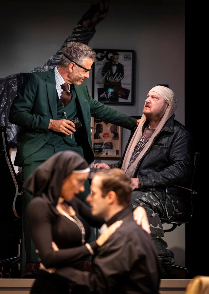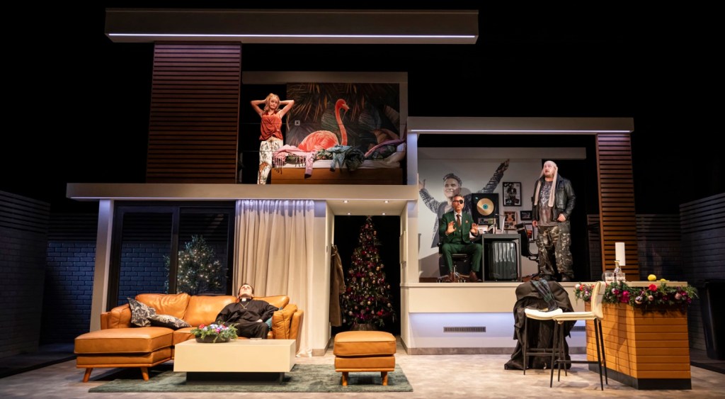 Direction from Philip Franks definitely favours the farcical this time around, and again manages to deliver on Betts’ many unexpected twists and turns – the play is intentionally “ludicrous” and is best described as another “anything goes” ride. Colin Falconer’s designs are in classic bedroom farce territory, too – on two levels covering various rooms and an outside space, meaning the comings and goings of characters and outlandish plot developments are well supported.